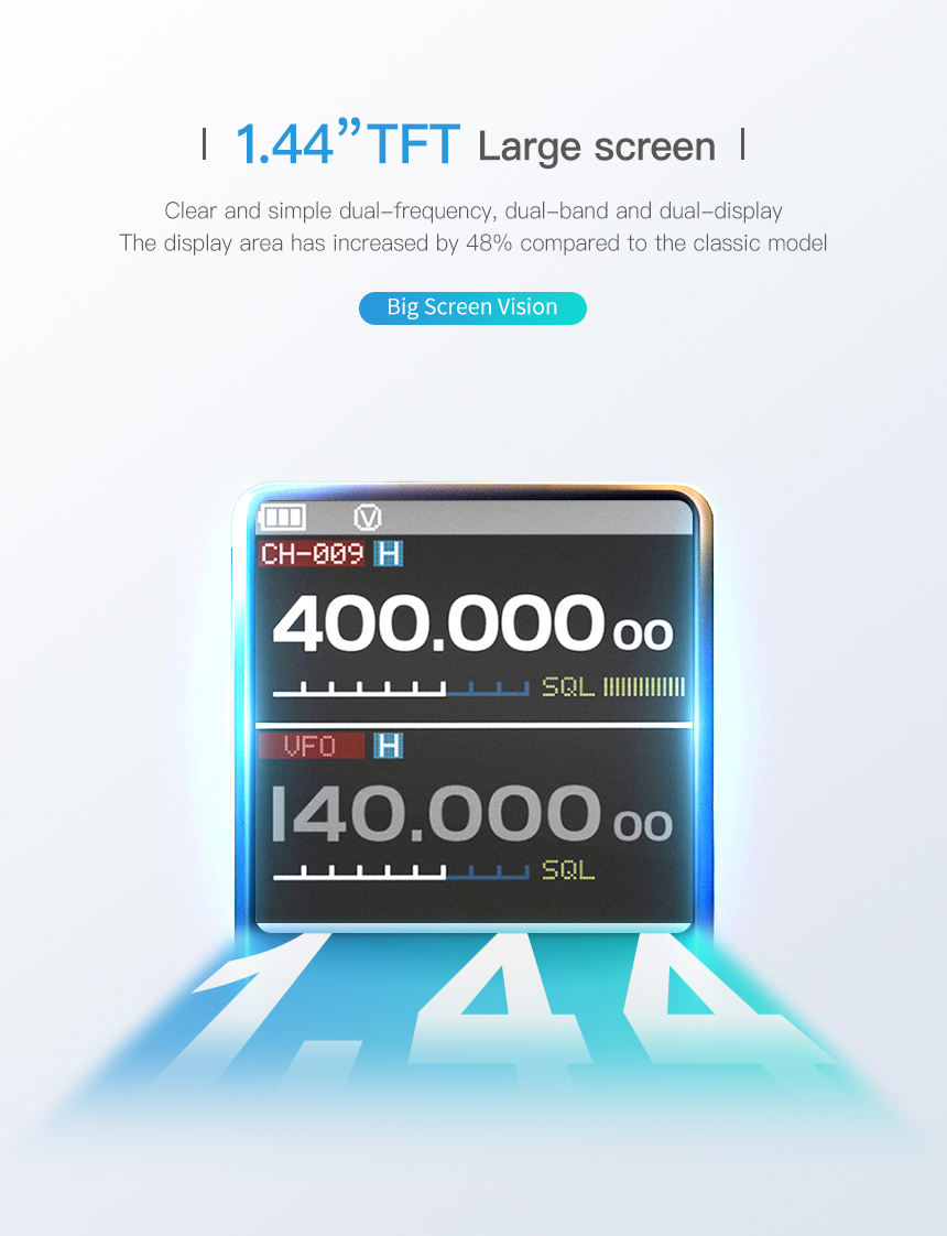 Equipped with a 1.44-inch colorful LED large screen, the walkie talkie provides clear and intuitive display of working status, frequency, and other key information, making it easy to read even in outdoor light conditions. With 5W high power support, it ensures stable signal transmission and a communication range of up to 8km, effectively covering short to medium distance communication needs in outdoor activities, sports events, and other scenarios.